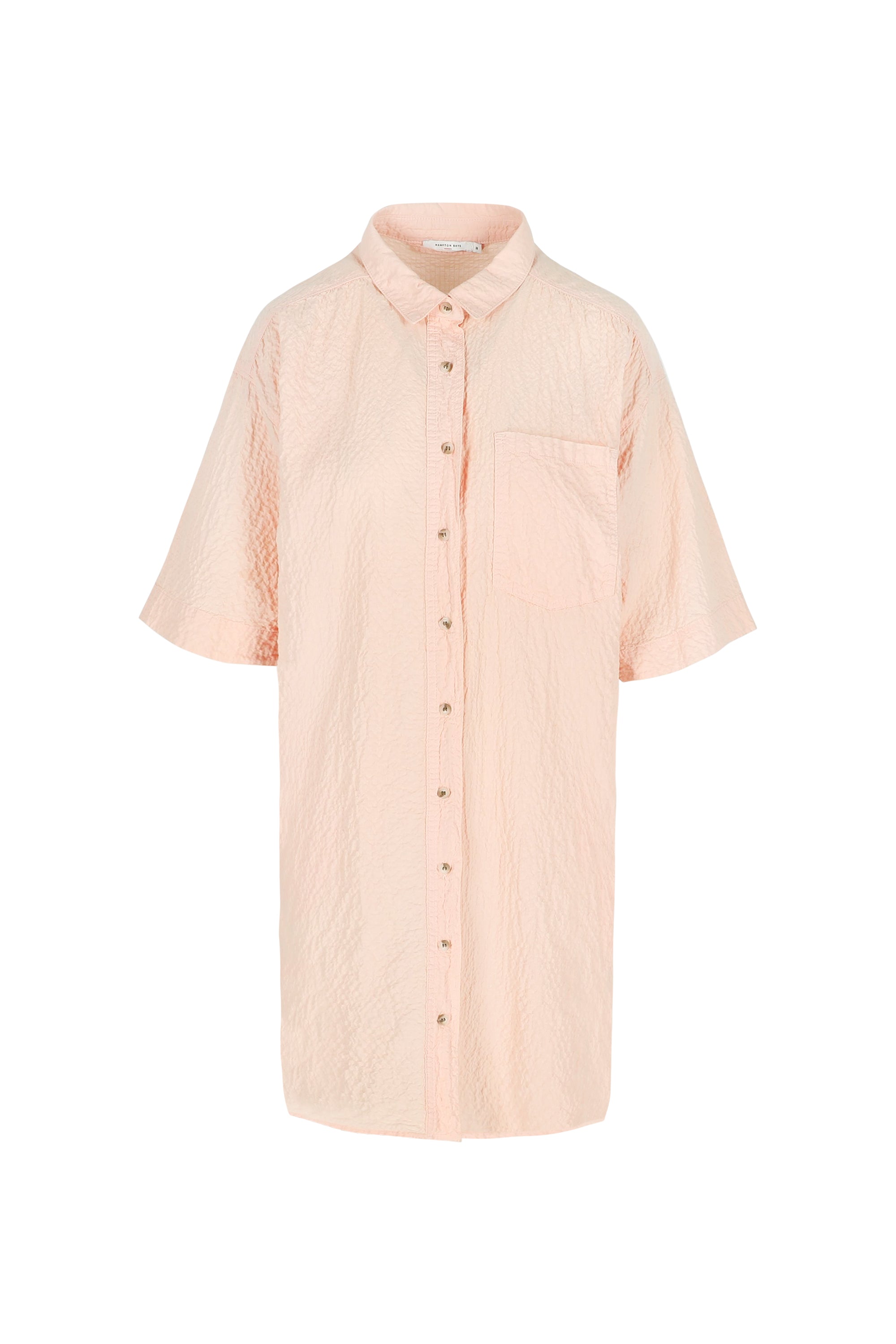 Ontmoet de ultieme all-in-one voor zonnige dagen. De Ithaca jurk combineert het tijdloze gemak van een hemdjurk met de dromerige uitstraling van de kleur English Rose. De lichte stof met zijn karakteristieke 'crinkle' textuur geeft de jurk een moderne, levendige diepte en zorgt ervoor dat hij werkelijk zijdezacht aanvoelt op de huid. Met haar klassieke kraag, volledige knoopsluiting en relaxte korte mouwen is dit dé jurk die je moeiteloos van een ontspannen ochtend naar een stijlvolle avond brengt.