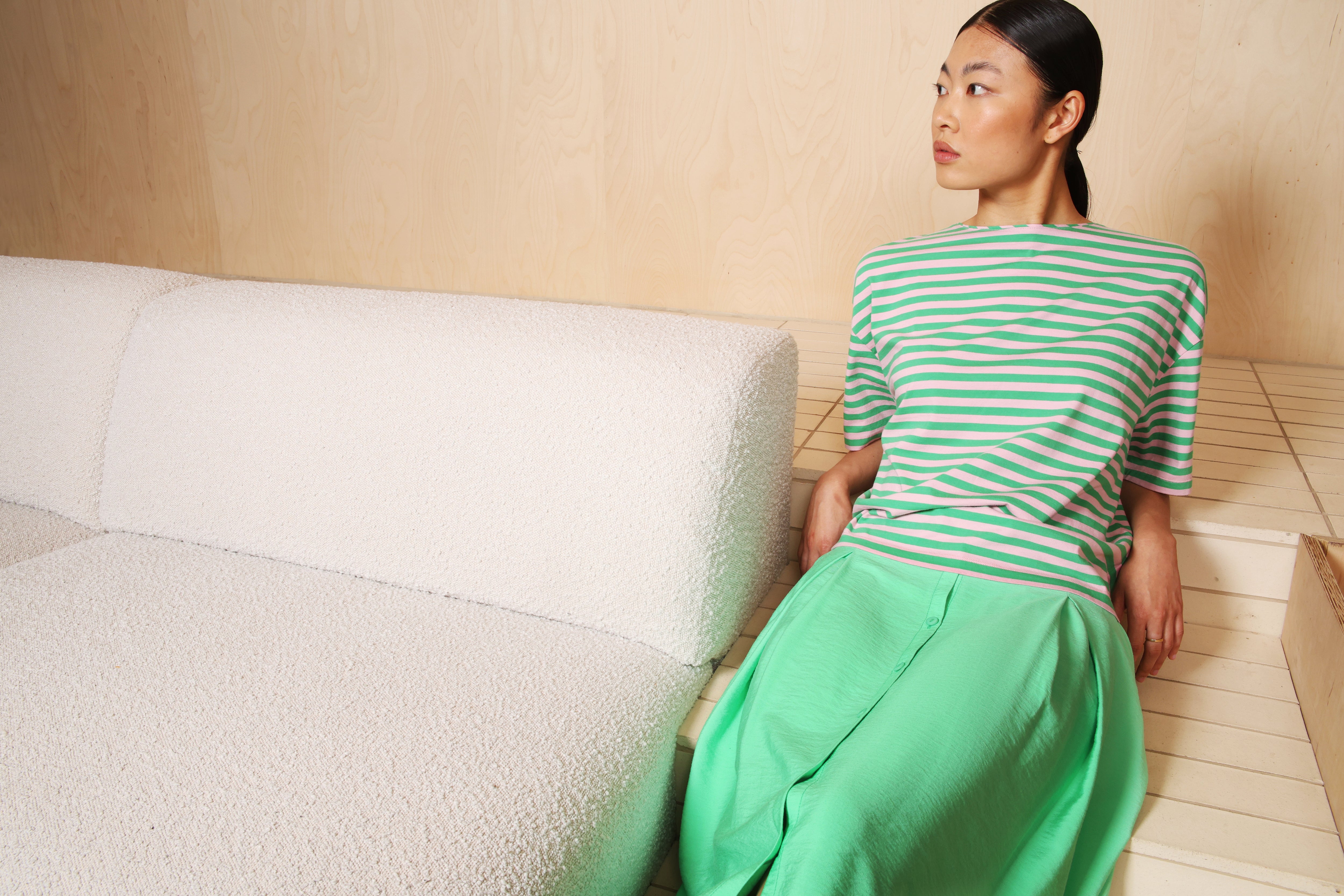 Breng beweging en kleur in je dag met de Santiago rok. Deze zwierige mid-lengte rok is nu al een ode aan de zomer. Uitgevoerd in een 'Spring bud' groen, valt deze rok op door de knoopjes vooraan en de fijne plooitjes die zorgen voor een flatterend volume. Of je nu door de stad wandelt of een zomerse lunch hebt, de Santiago rok geeft je direct een zelfverzekerde uitstraling.