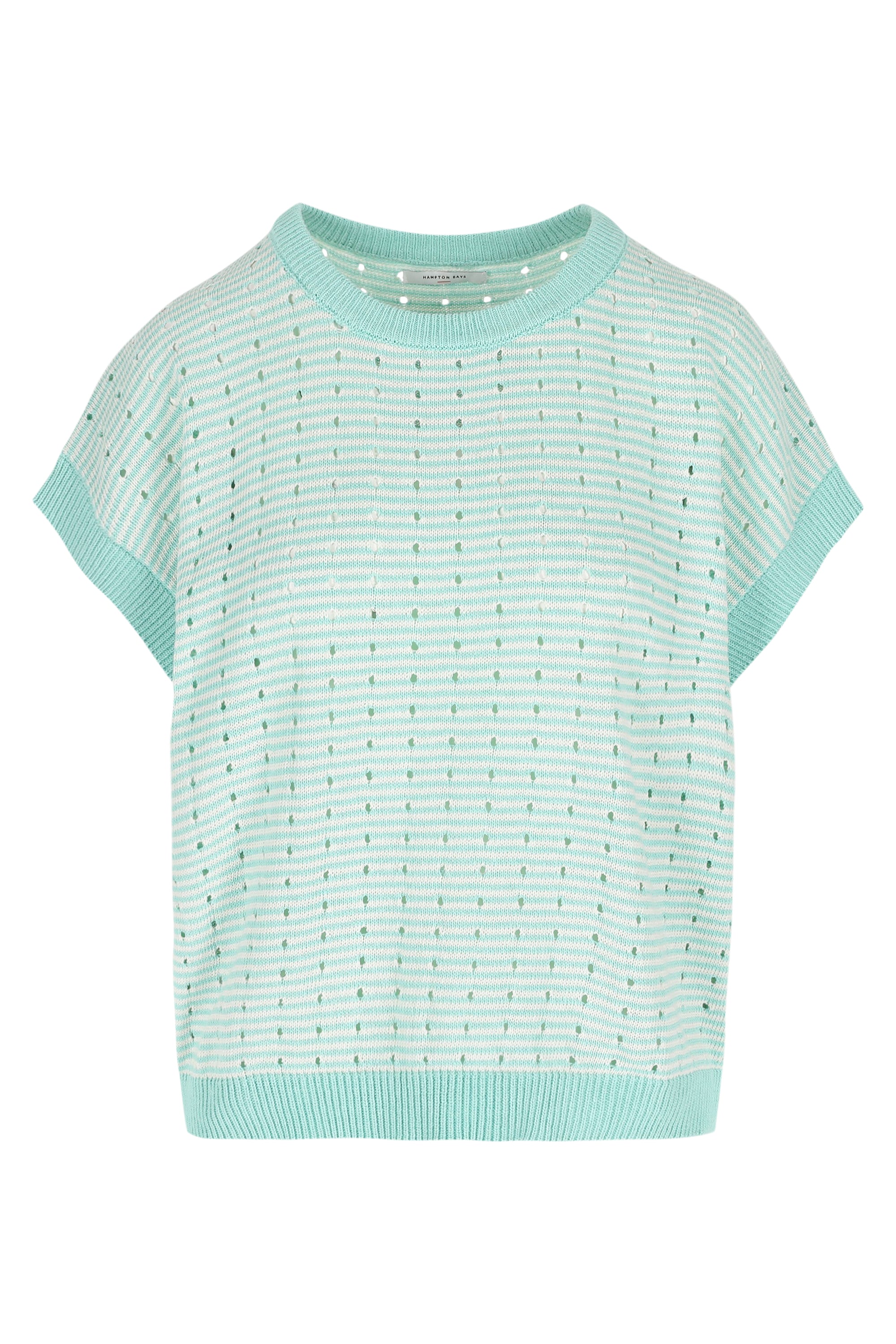 Breng karakter in je daily look met de Toulouse knit. Deze debardeur in een relaxte fit valt direct op door de prachtige combinatie van een fijn ajourgebreid patroon en een streepjespatroon in de diepe, elegante 'Yucca' tint met offwhite. De kleine gaatjes in het breiwerk zorgen niet alleen voor een romantische textuur, maar maken de knit ook heerlijk luchtig voor warmere dagen. Met zijn korte raglan mouwen en nonchalante pasvorm is de Toulouse de perfecte mix tussen comfortabel en chic.
