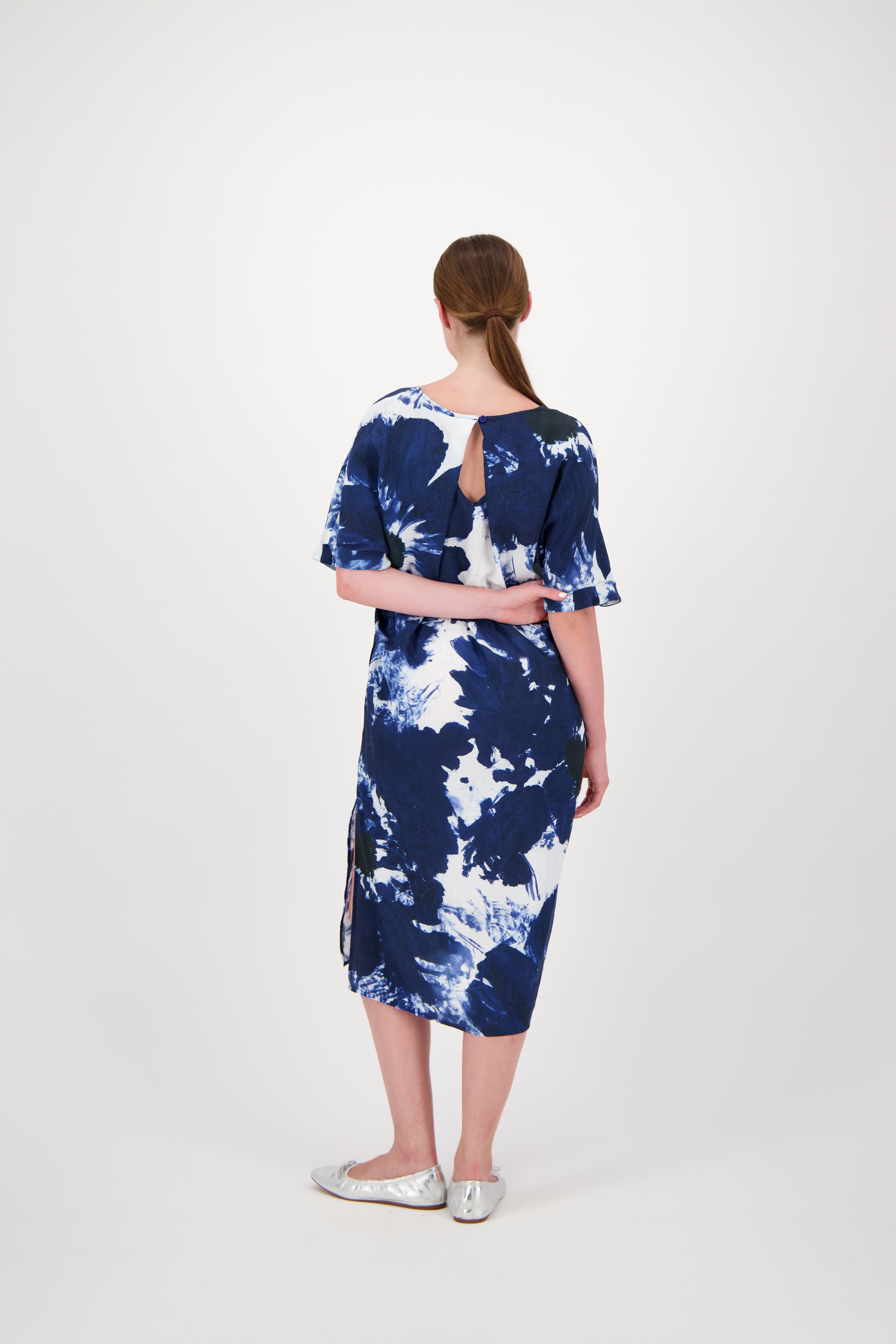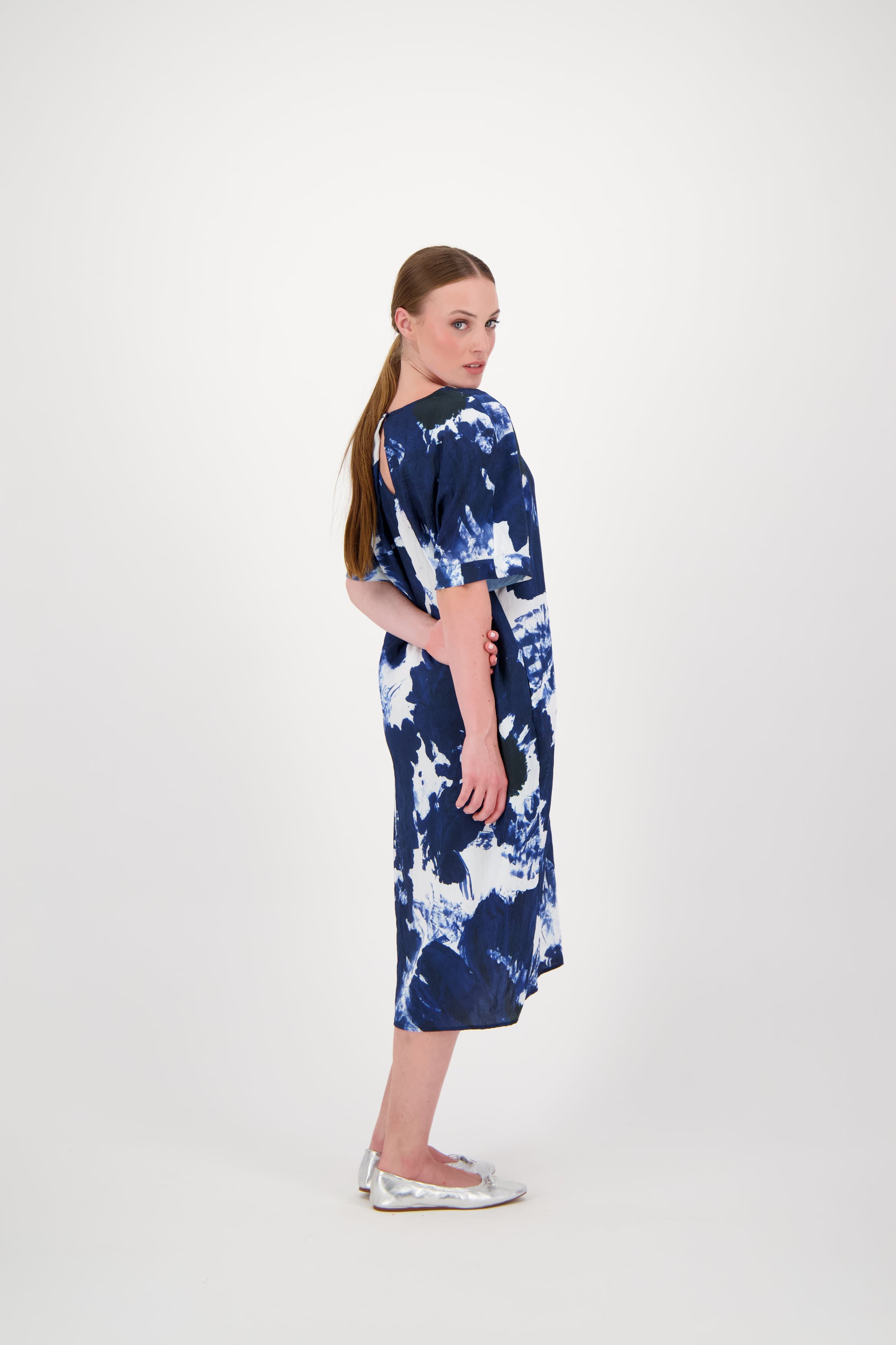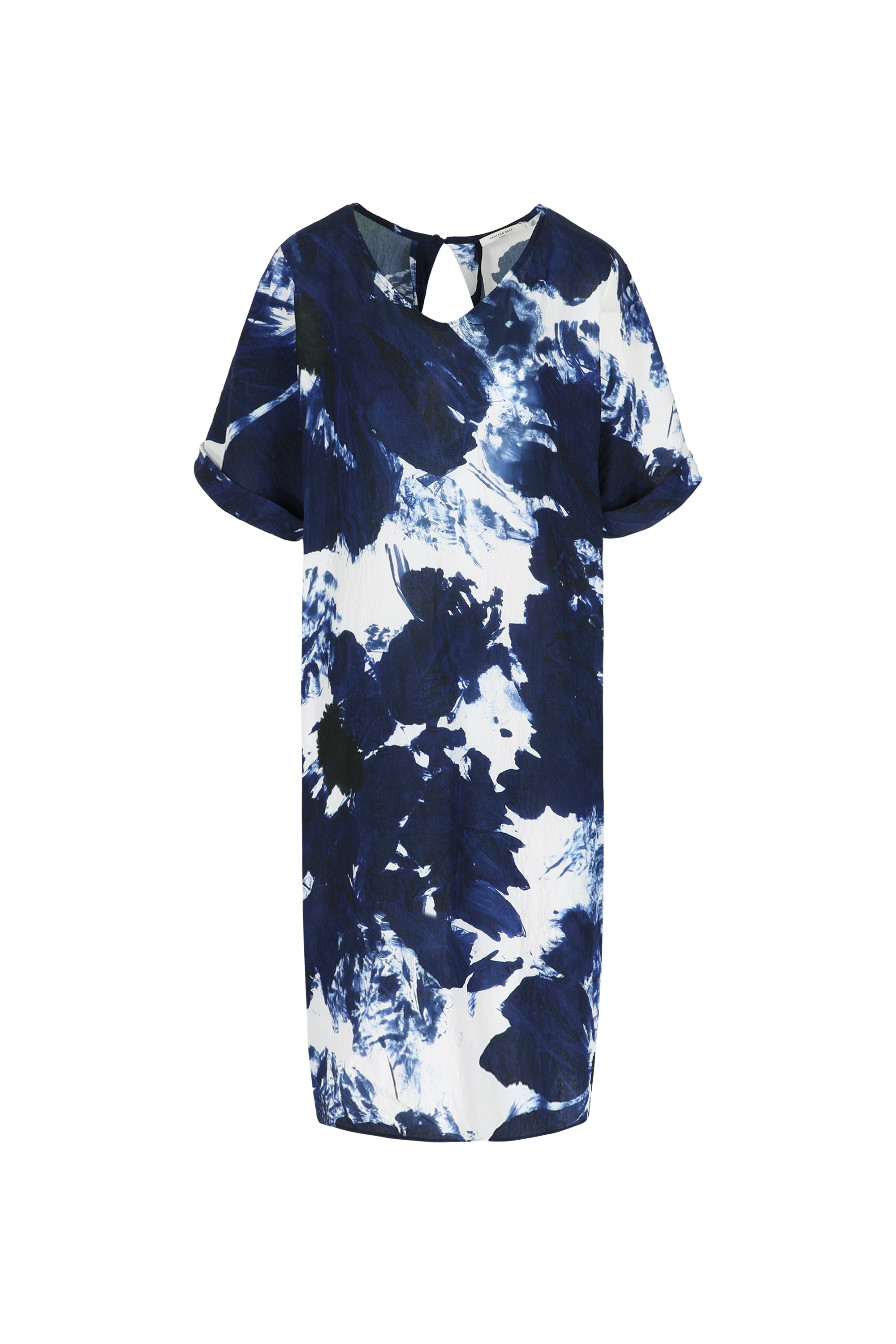 Make an unforgettable impression with the Shangai dress in this abstract print. The familiar, comfortable silhouette serves as a canvas for an artistic "Moon Navy" design: an abstract floral print in deep blue and bright white that evokes a modern painting. The dress retains its beloved details, such as the elegant V-neck and short, rolled-up sleeves. The surprising open back detail adds a light and feminine touch, making this dress both stylish and exciting.